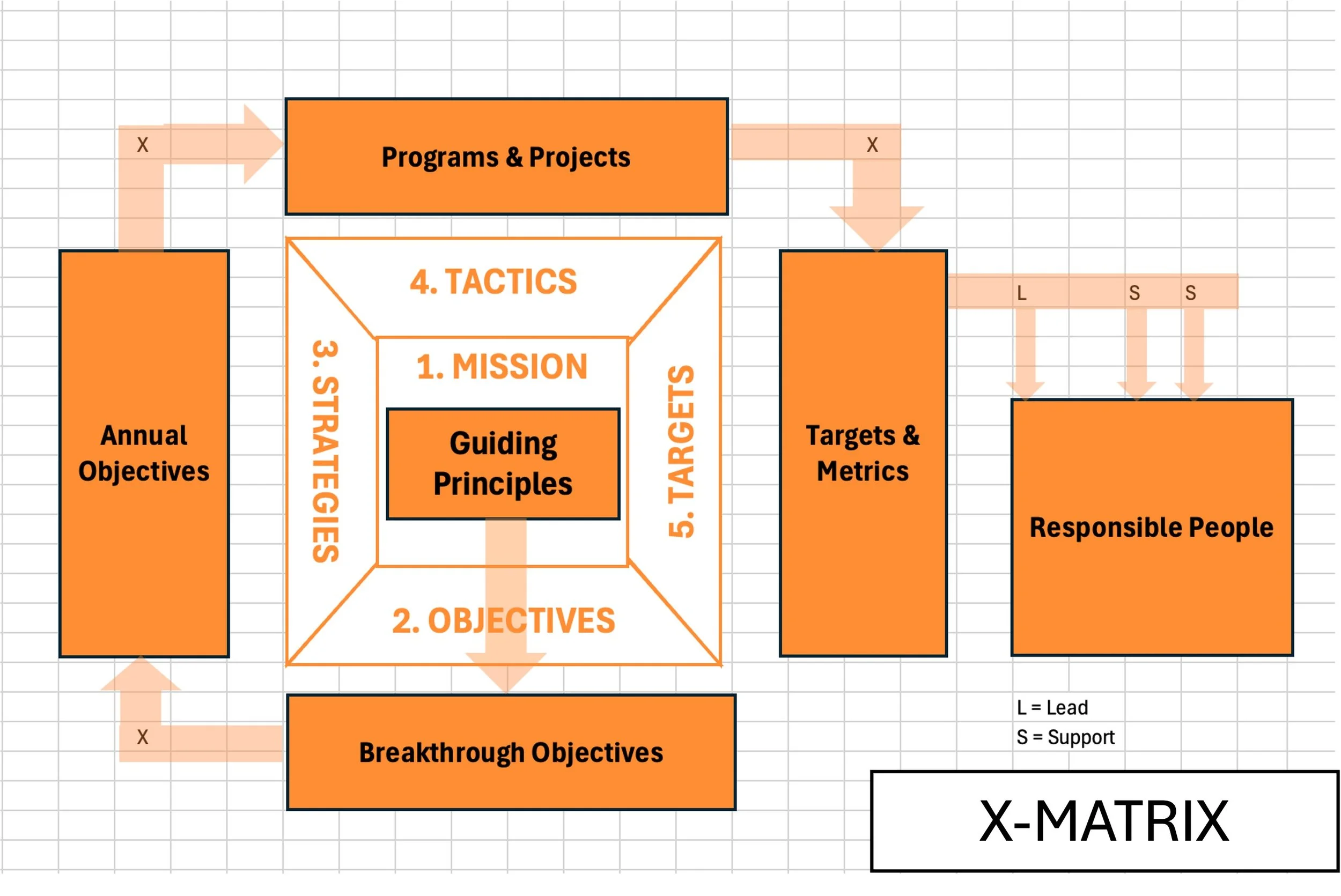 The bowler diagram is a key execution companion to the X-Matrix in Hoshin Kanri. While the X-Matrix shows how strategic objectives, initiatives, metrics, and owners are aligned, the bowler shows how those objectives are actually performing over time. It translates strategy into a simple, visual performance scoreboard—typically organized by objective, KPI, target, and time periods (monthly or quarterly)—so leaders can quickly see whether results are on track, at risk, or off track.