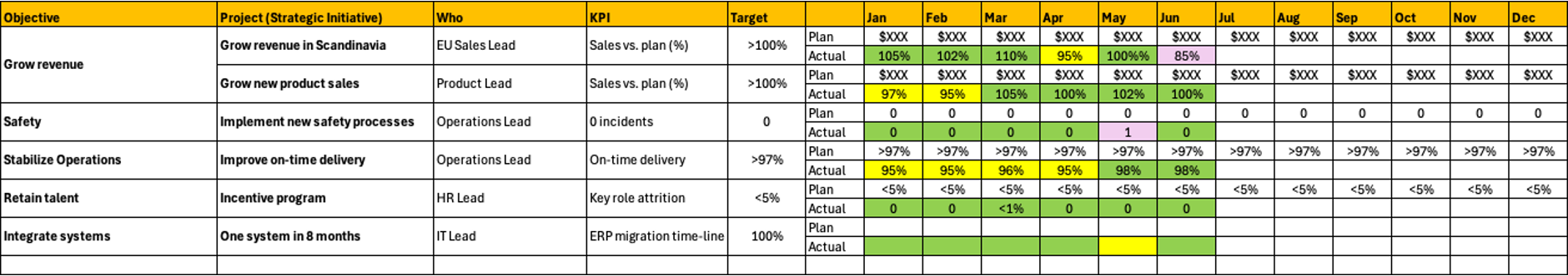 Each objective is supported by a focused set of initiatives—programs or projects that directly enable success. Those initiatives are assigned clear ownership, with accountable leaders and supporting teams responsible for delivery. Progress is made visible through a limited set of performance indicators, allowing teams to track results, identify gaps, and take corrective action as needed.