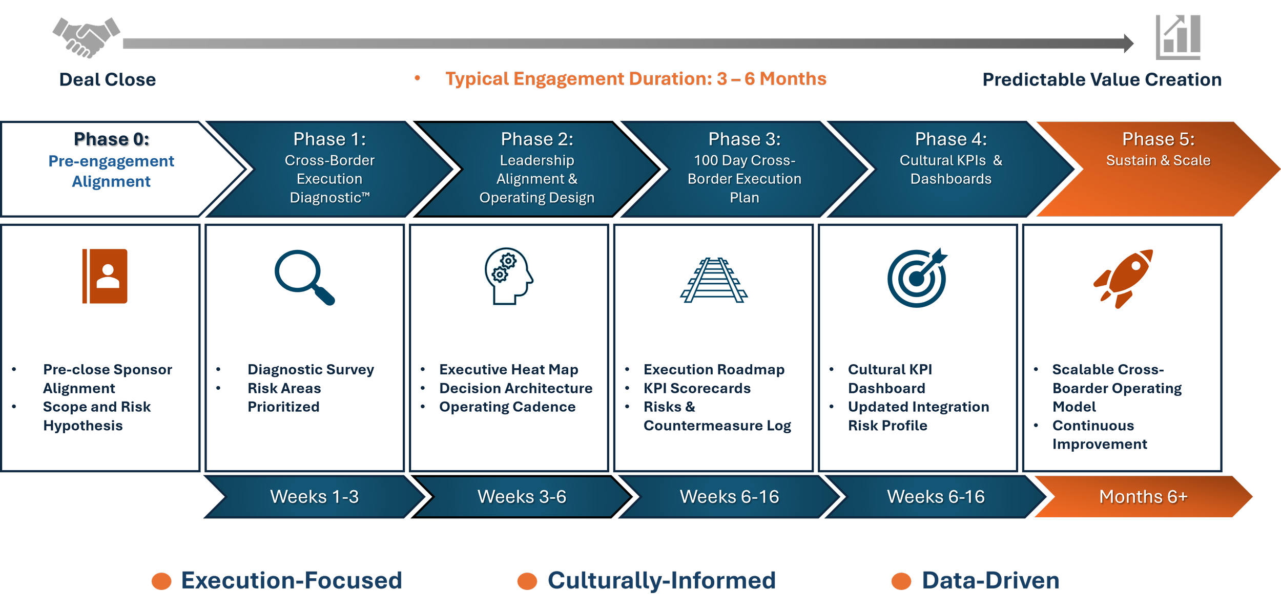 We help clarify decision rights, escalation paths, and operating rhythms across geographies—fully aligned with your client’s integration roadmap.
